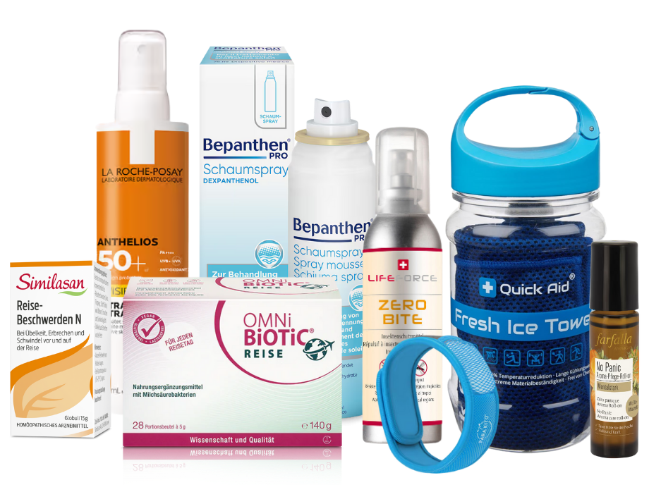 Hier haben wir ein paar hilfreiche Produkte für Sie zusammengestellt, die Ihnen unterwegs Sicherheit geben und Sie auf Ihrer Reise bestmöglich gesundheitlich unterstützen.